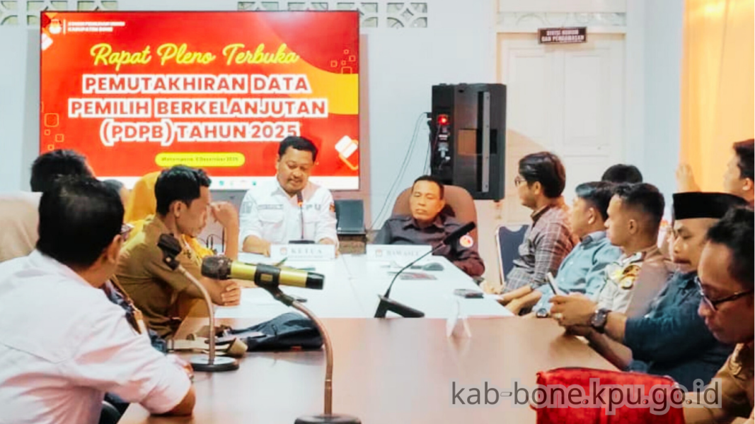 Watampone, kab-bone.kpu.go.id - Komisi Pemilihan Umum Kabupaten Bone menyelenggarakan Rapat Pleno Terbuka Pemutakhiran Data Pemilih Berkelanjutan (PDPB) Triwulan IV Tahun 2025 bertempat di Media Center KPU Bone, Senin, 8 Desember 2025. Rapat Pleno dibuka secara resmi oleh Ketua KPU Kabupaten Bone, Yusran Tajuddin didampingi oleh para Anggota KPU dan Sekretaris Kabupaten Bone. Selanjutnya pembacaan Berita Acara tentang Rekapitulasi Pemutakhiran Data Pemilih Berkelanjutan oleh Ketua Divisi Hukum dan Pengawasan, Rusnaedi yang memaparkan total daftar pemilih berkelanjutan sebanyak 610.146 dari 27 (dua puluh tujuh) kecamatan dan 372 (tiga ratus tujuh puluh dua) desa/kelurahan yang ada di kabupaten Bone dengan rincian jumlah laki-laki sebanyak 292.597 dan jumlah perempuan sebanyak 317.549. Berdasarkan Rekapitulasi Perubahan Pemilih Pemutakhiran Data Pemilih Berkelanjutan, rincian data lainnya, yaitu Jumlah Pemilih Baru sebanyak 10.730 orang, jumlah Pemilih Tidak Memenuhi Syarat (TMS) sebanyak 3.963 orang dan jumlah Perbaikan Data Pemilih sebanyak 4.679 orang. ....