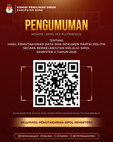 kab-bone.kpu.go.id - KPU Kabupaten Bone melaksanakan Rapat Pleno Penetapan Hasil Pemutakhiran Data dan Dokumen Partai Politik secara berkelanjutan melalui SIPOL Semester II pada bulan Juli s.d. Desember Tahun 2025. Kegiatan ini dihadiri oleh Ketua Bawaslu Kabupaten Bone, Ketua dan Anggota KPU Kabupaten Bone, Sekretaris, serta staf Sub Bagian Teknis Penyelenggaraan dan Hukum KPU Kabupaten Bone. Sebagai hasil dari proses pemutakhiran data dan dokumen partai politik secara berkelanjutan melalui SIPOL Semester II Tahun 2025 ditemukan ada 5 (Lima) Partai Politik yang telah melakukan pemutakhiran, yaitu Partai Gelombang Rakyat Indonesia, Partai Persatuan Pembangunan, Partai NasDem, Partai Keadilan Sejahtera, dan Partai Kebangkitan Bangsa. ....