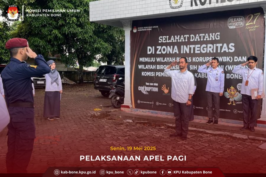 Hadir dalam pelaksanaan upacara Ketua KPU Kabupaten Bone, Anggota KPU Divisi Teknis Penyelenggaraan, Anggota KPU Divisi Hukum dan Pengawasan, Sekretaris, Kepala Subbagian beserta jajaran staf Sekretariat KPU Kabupaten Bone.