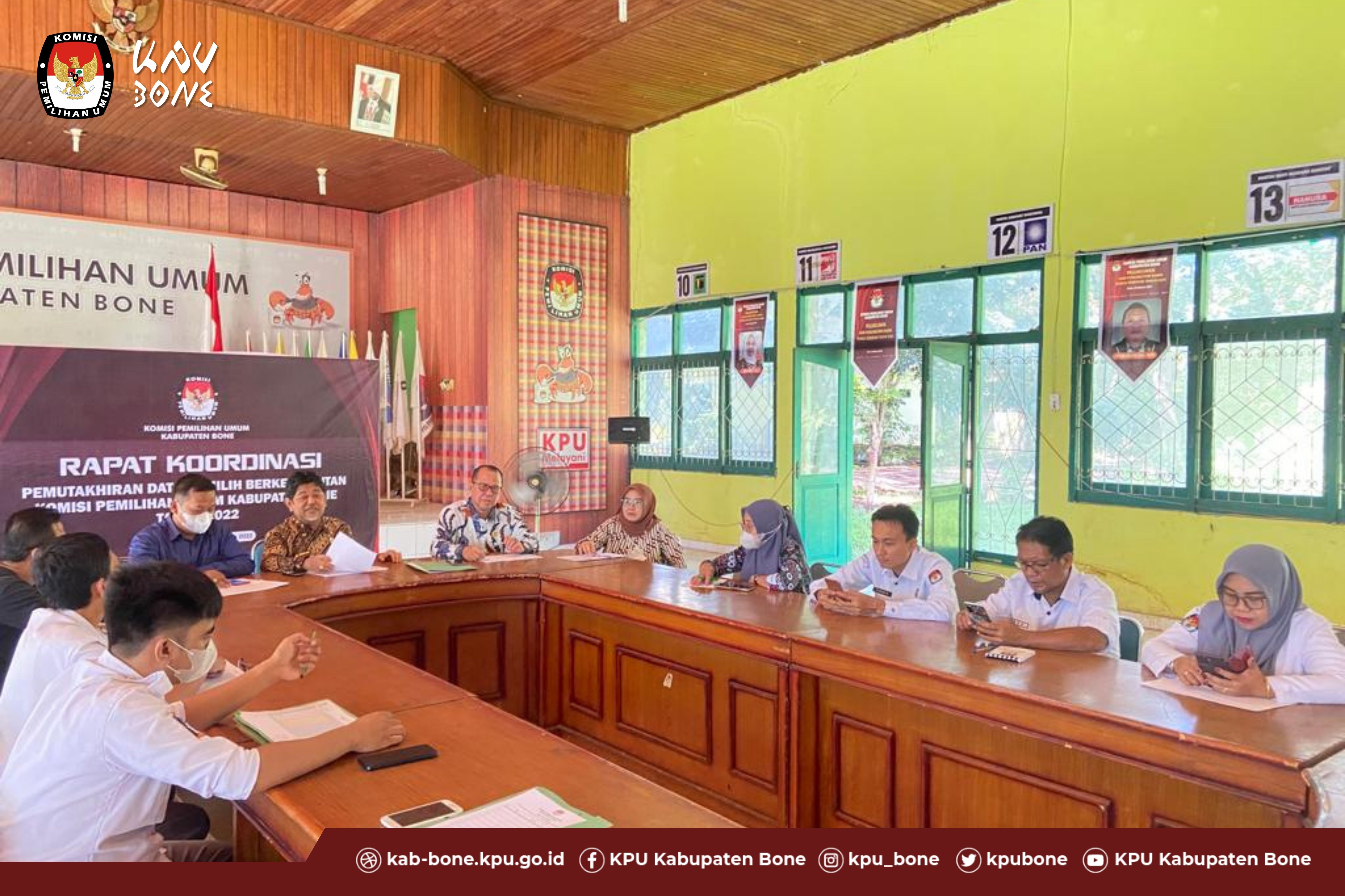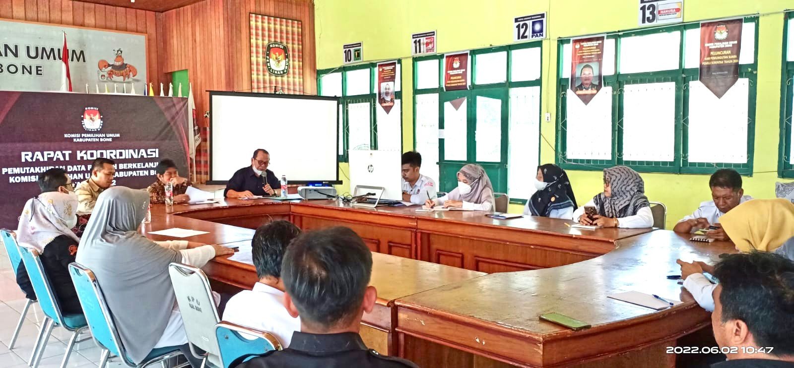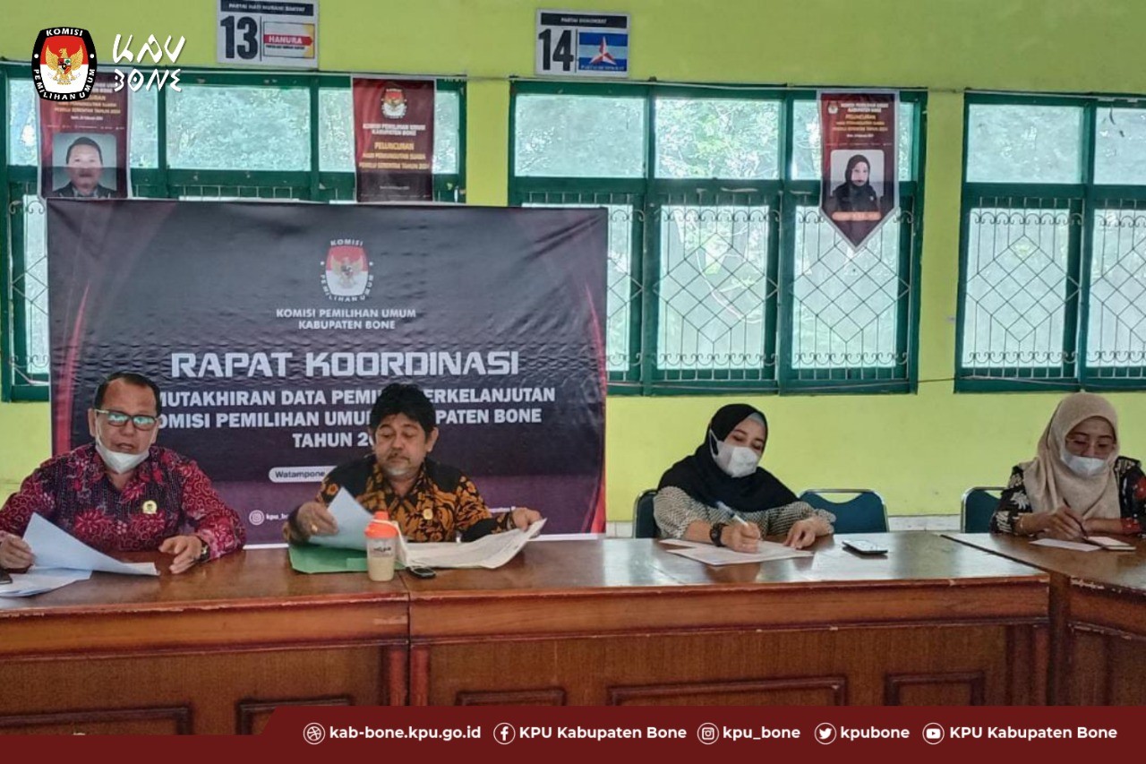KPU BONE - (Kamis, 28/4/2022) bertempat di Kantor KPU Kabupaten Bone, pukul 10.00 Wita, KPU Kabupaten Bone melaksanakan Rapat Pleno Daftar Pemilih Berkelanjutan untuk Periode April Tahun 2022 ditingkat Kabupaten Bone. Berdasarkan ketentuan Peraturan Komisi Pemilihan Umum Nomor : 6 Tahun 2021 tanggal Sebelas bulan November Tahun 2021 tentang Pemutakhiran Data Pemilih Berkelanjutan, hasil Rapat Pleno yang dilakukan oleh KPU Kabupaten Bone menghasilkan hal sebagai berikut: 1. Rekapitulasi Daftar Pemilih Berkelanjutan dengan jumlah sebanyak 550.828 (Lima Ratus Lima Puluh Ribu Delapan Ratus Dua Puluh Delapan) pemilih dengan rincian pemilih laki-laki berjumlah 260.615 (Dua Ratus Enam Puluh Ribu Enam Ratus Lima Belas) pemilih dan pemilih perempuan berjumlah 290.213 (Dua Ratus Sembilan Puluh Ribu Dua Ratus Tiga Belas) pemilih tersebar di 27 (Dua Puluh Tujuh) Kecamatan sesuai dengan rincian sebagaimana terlampir dalam Berita Acara ini. 2. Menerima masukan data dari Dinas Kependudukan dan Pencatatan Sipil Kabupaten Bone, Badan Pengawas Pemilihan Umum Kabupaten Bone, Dinas Kesehatan Provinsi Sulawesi Selatan, Kepala Desa / Lurah. Rapat Pleno yang dibuka langsung oleh Ketua KPU Kabupaten Bone ini dihadiri oleh Anggota KPU Kabupaten Bone, Sekretaris, Para Kasubbag, Seluruh Staf beserta PPNPN KPU Kabupaten Bone. KLIK DI SINI untuk melihat berita acara Rapat Pleno PDPB KPU Bone