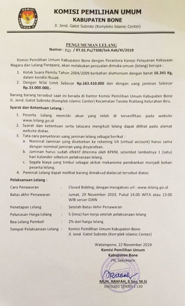 Pengumuman Lelang Kotak Suara Pemilu Tahun 2004/2009 KPU Kabupaten Bone Jumat, 22 November 2019 00:00 441 Baca Selengkapnya